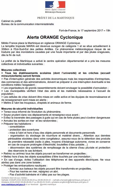 Suite au passage en vigilance orange cyclonique, la Préfecture de Martinique a décidé de fermer tous les établissements scolaires dont l’université et les crèches (accueil mineurs/enfants).