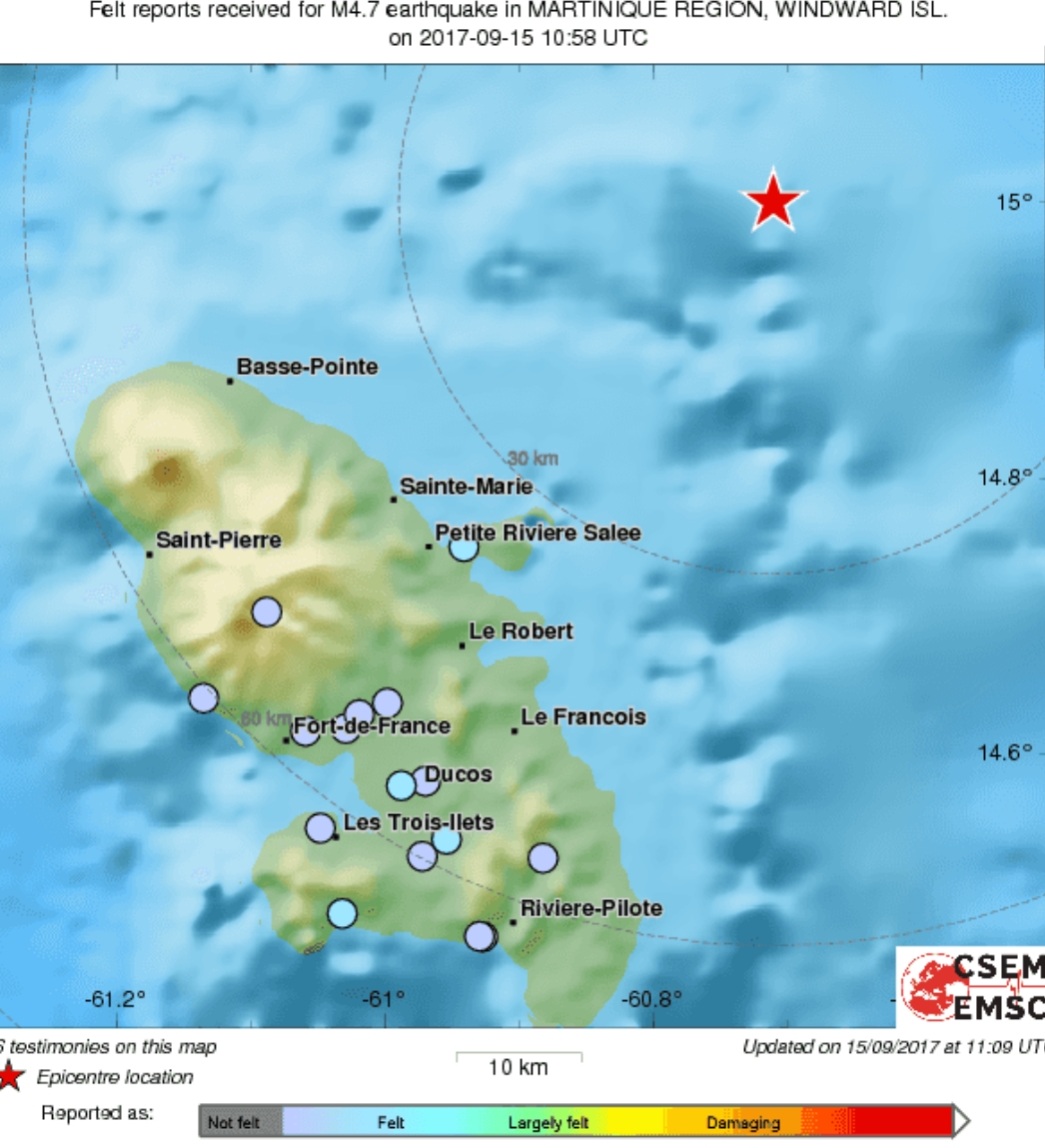 Un séisme de magnitude 4,7 sur l’Echelle de Richter d’après UWI a été ressenti en Martinique, ce vendredi (15 septembre 2017).