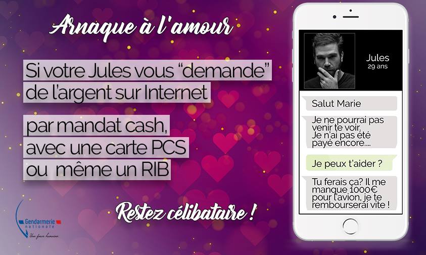 Si vous faites des rencontres sur internet soyez prudent. « Si votre Jules vous demande de l’argent sur internet par mandat cash avec une carte PCS ou même un RIB, restez célibataire ».
