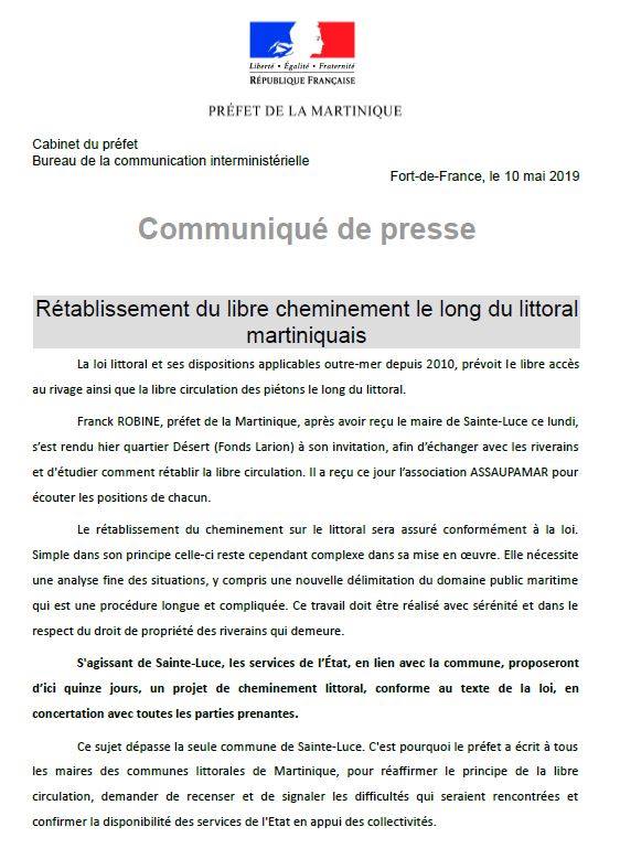 Communiqué de presse de la Préfecture de Martinique au sujet du rétablissement du libre cheminement le long du littoral martiniquais.