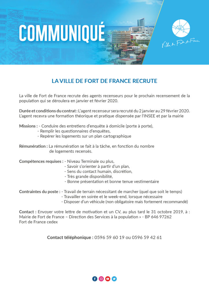 La ville de Fort-de-France recrute actuellement des agents recenseurs pour le prochain recensement de la population qui se déroulera en janvier 2020.