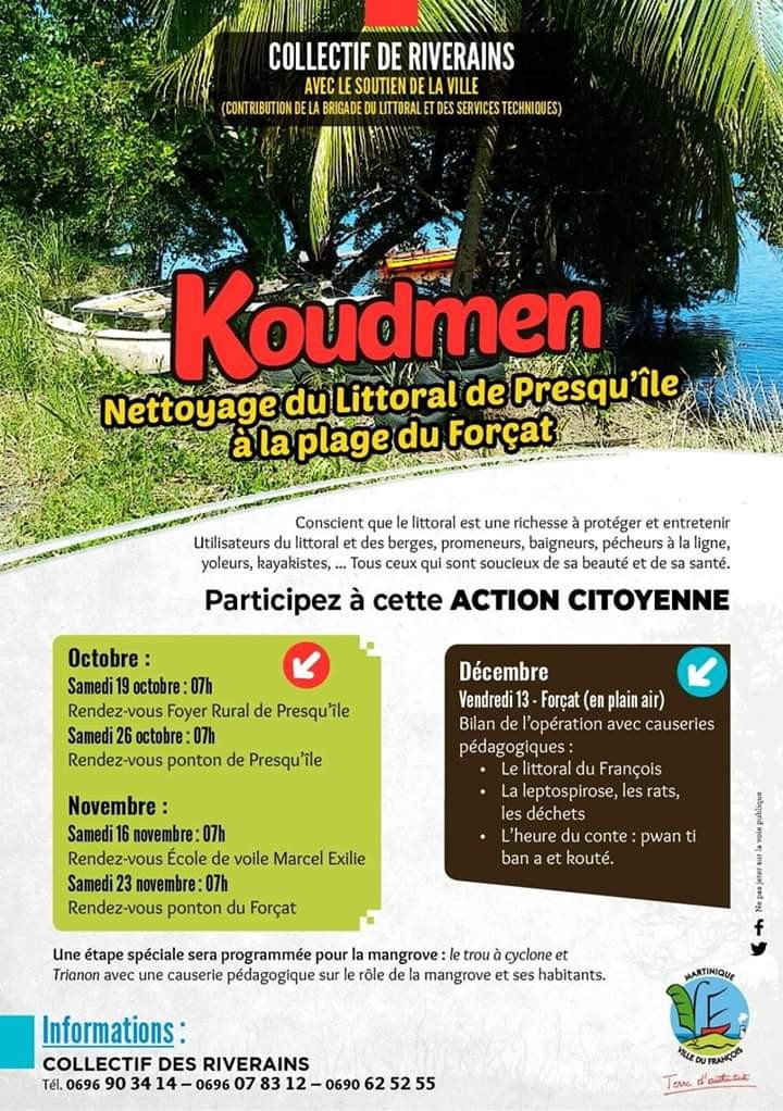 « Koudmen à Presqu’Île » est une opération citoyenne de nettoyage du littoral de Presqu’Île à la plage du Forçat au François qui est actuellement en cours de la commune.