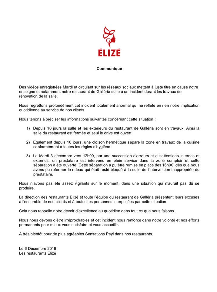 Suite à ça, le groupe Elizé a décidé de réagir et fait son mea-culpa, tout en précisant quelques informations concernant cette situation.. « La direction des restaurants Elizé et toute l’équipe du restaurant de Galleria présentent leurs excuses à l’ensemble de nos clients et à toutes les personnes interpellées par cette situation. »