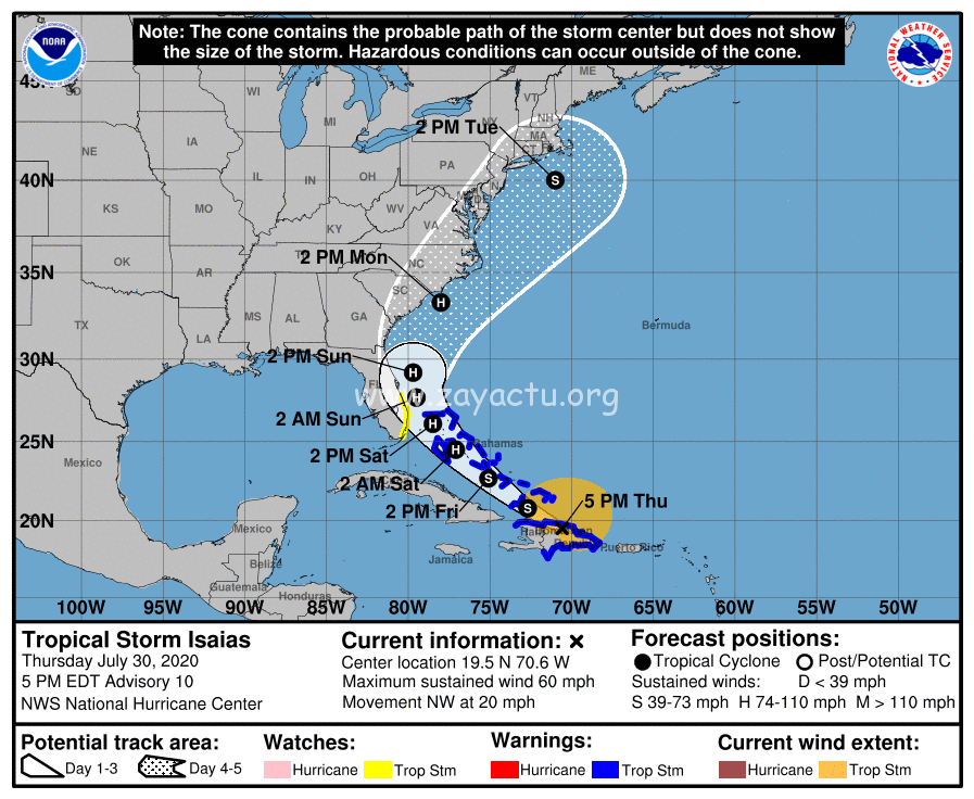 Malheureusement, un nouveau développement du phénomène est attendu dans les prochaines heures. Isaias devrait devenir un ouragan, demain soir avant son passage sur les Bahamas. Pour rappel, cette région du globe se remet tout doucement du passage de l’ouragan Dorian en septembre 2019.