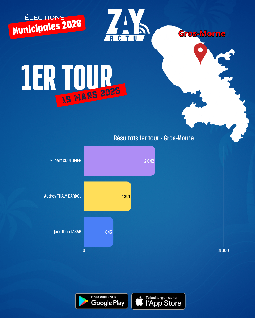Au Gros-Morne, aucun candidat n’est élu dès le premier tour. La commune se dirige vers une triangulaire entre le maire sortant Gilbert Couturier, Audrey Thaly-Bardol et Jonathan Tabar au second tour.