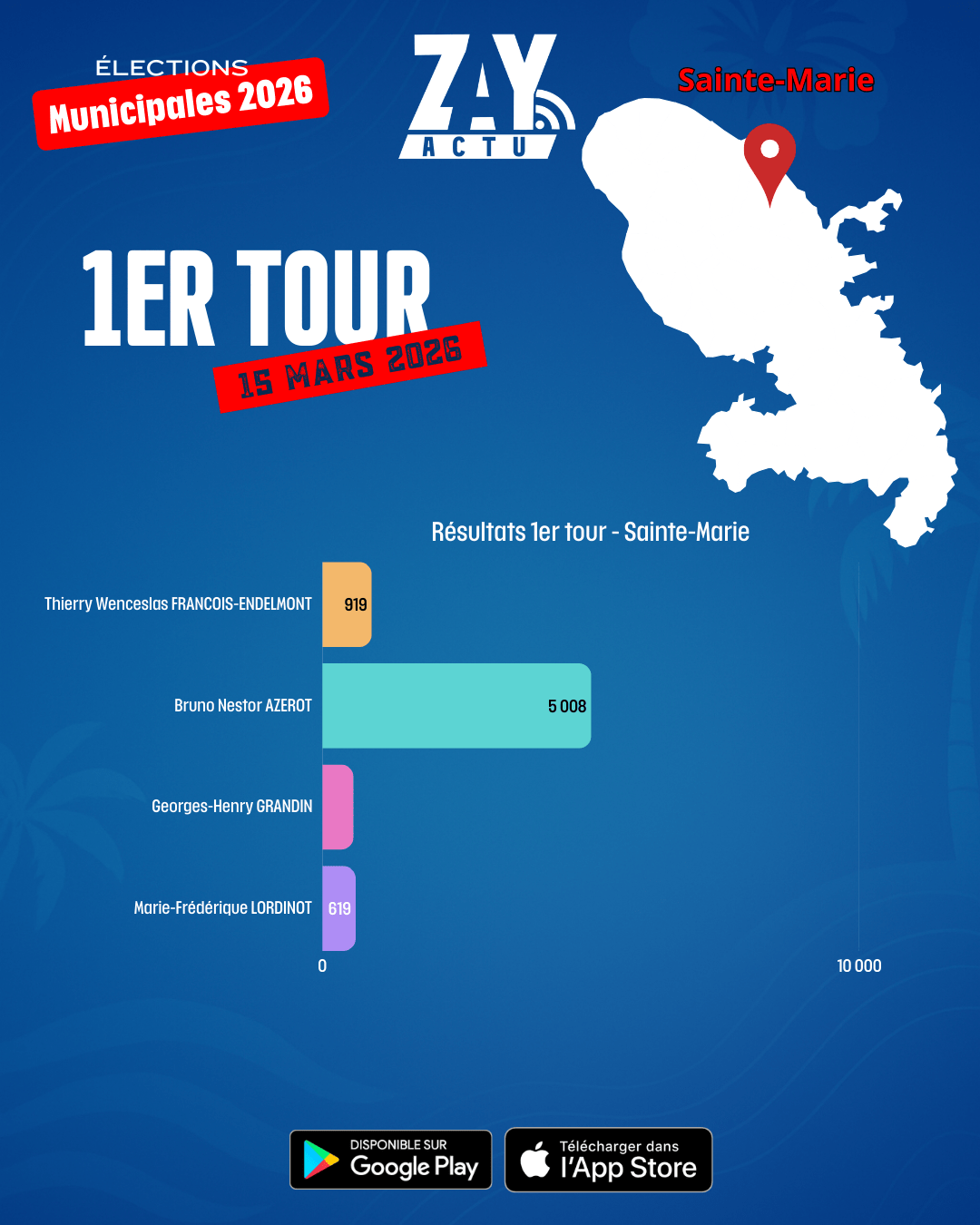 À Sainte-Marie, Bruno-Nestor Azerot est largement réélu avec 5 008 voix, soit 70,28 % des suffrages exprimés.