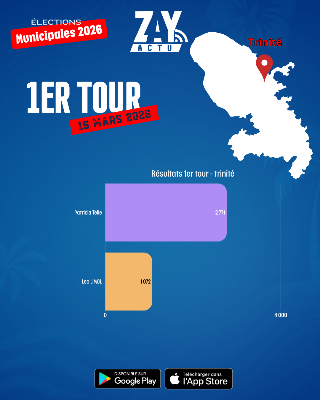 À Trinité, Patricia Telle est largement réélue avec 2 771 voix, soit 72,11 % des suffrages exprimés.