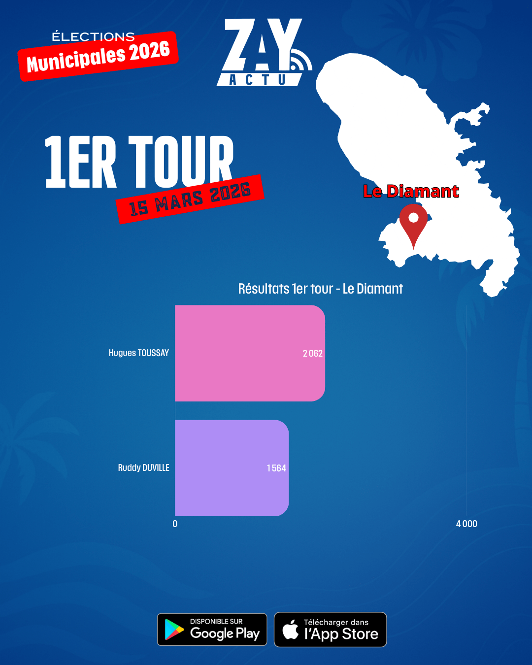 Au Diamant, Hugues Toussay remporte l’élection avec 2 062 voix, soit 56,70 % des suffrages.