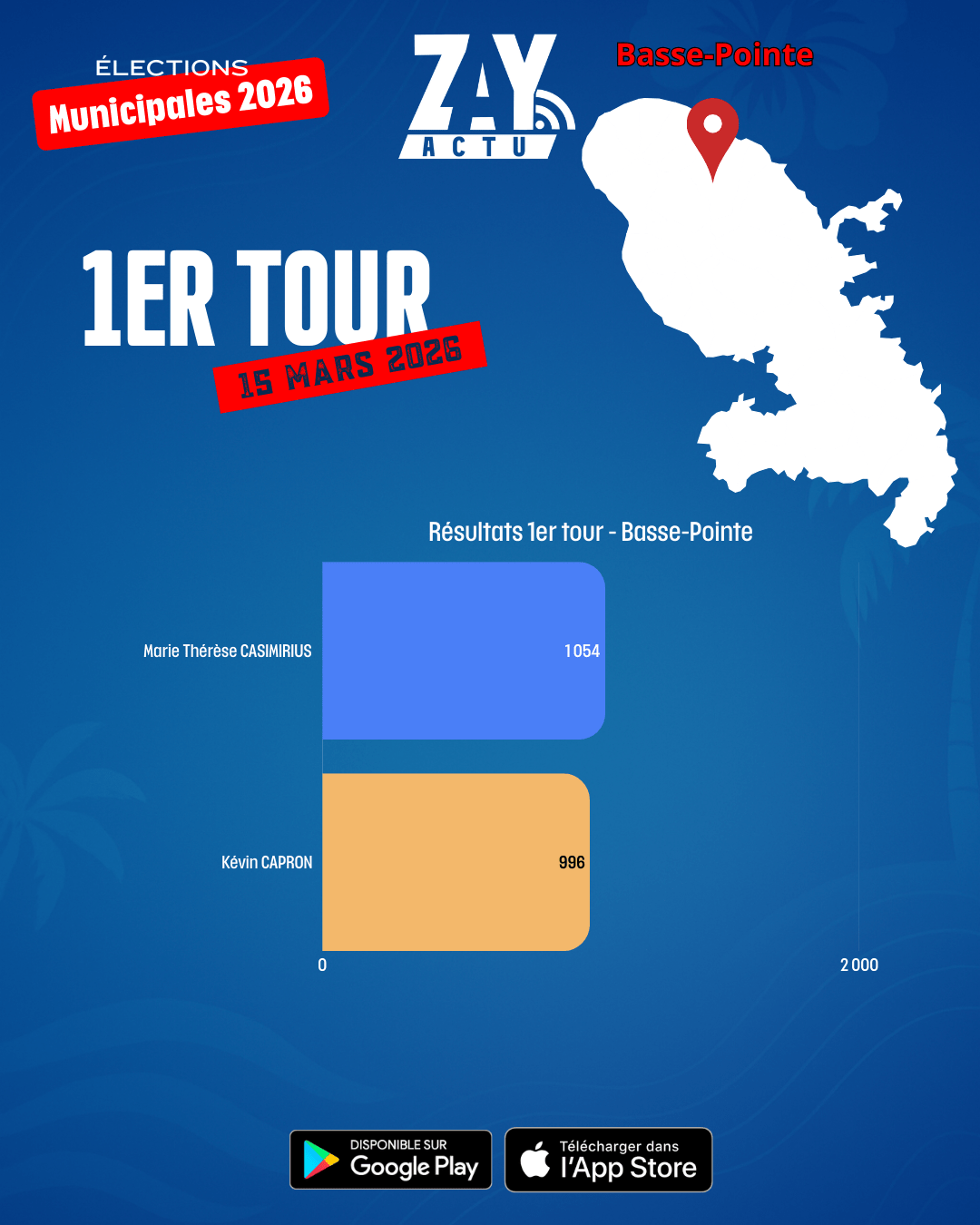 À Basse-Pointe, la maire sortante Marie-Thérèse Casimirius est réélue avec 1 054 voix, soit 51,41 % des suffrages exprimés.