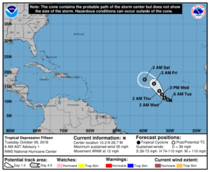 Ce mardi 9 octobre 2018 en milieu de matinée, comme déjà pressenti par le NHC, la tempête tropicale Nadine est née. Elle se déplace toujours à vitesse de 15 km/h avec des vents maximaux soutenus à près de 65 km/h avec des rafales un peu plus élevées. Un renforcement supplémentaire devrait se produire jusqu’à mercredi indique le NHC avec un affaiblissement dans la journée de jeudi.