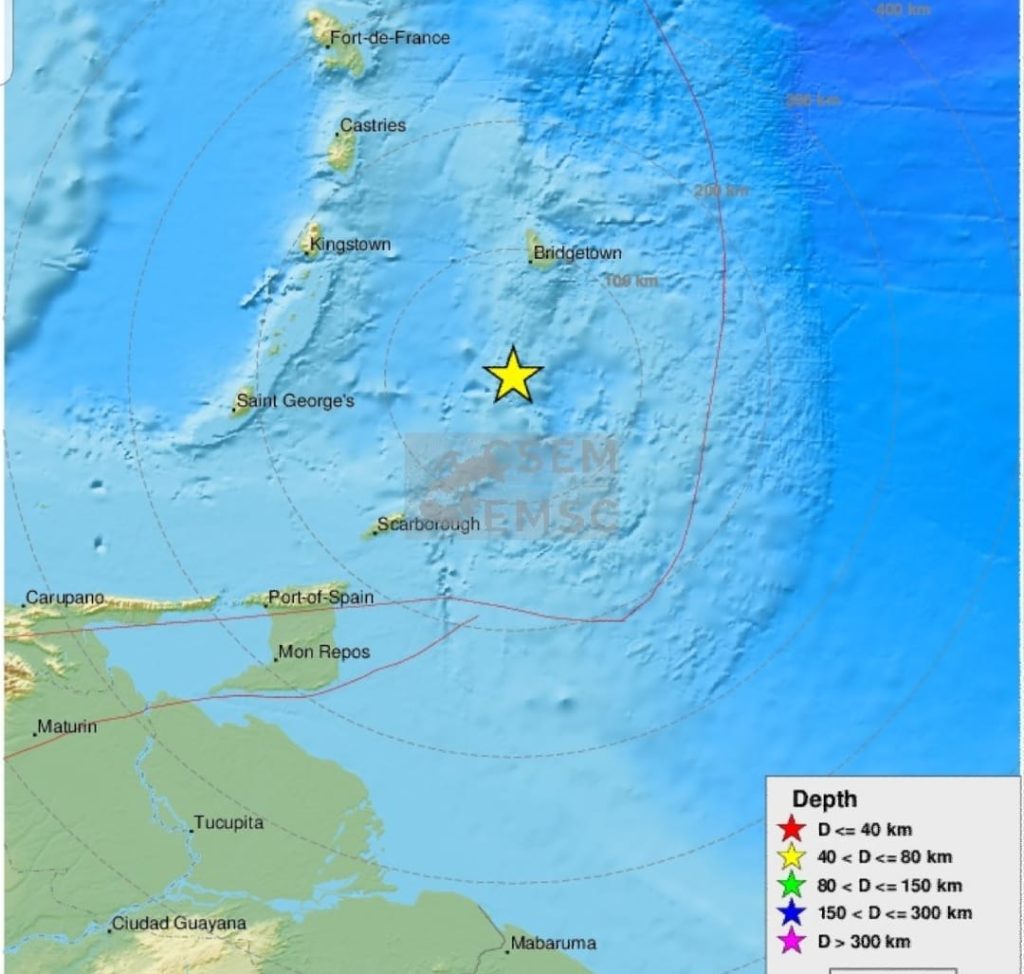 Ce samedi après-midi (20 octobre 2018) un séisme de magnitude 4,2 sur l’échelle de Richter a été enregistré entre la Barbade et Trinidad à 92 kilomètres au sud de Bridgetown à Barbade.