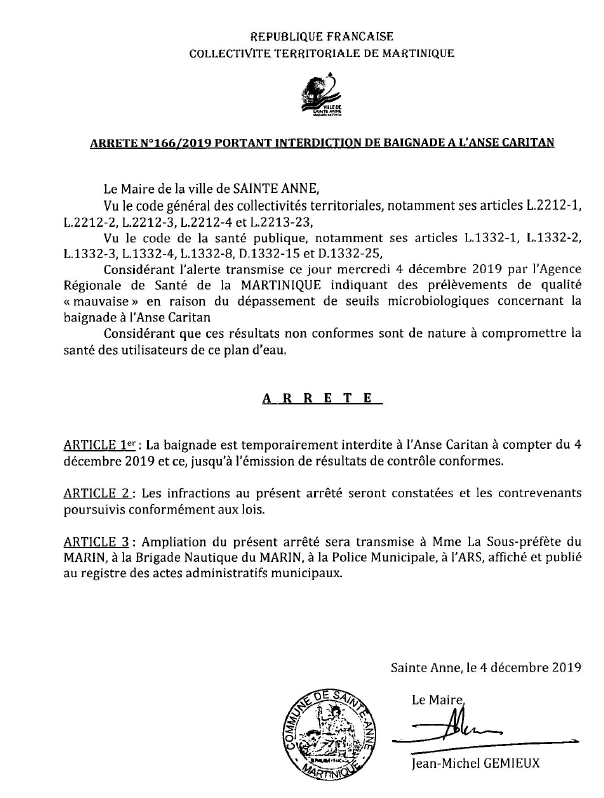 Une décision prise suite à l’alerte de l’Agence Régionale de Santé de Martinique (ARS), ce mercredi 4 décembre 2019 sur la qualité de l’eau. « Il est demandé à la population de bien vouloir respecter l’arrêté municipal N°166/2019 en date du 4 décembre 2019, portant interdiction de baignade à l’Anse Caritan à compter du 4 décembre et ce, jusqu’à l’émission de résultats de contrôles conformes » indique la municipalité.