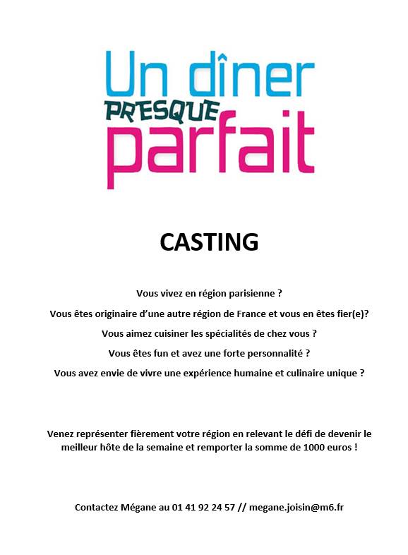 Des personnes venants des Dom-Tom et résidents en région parisienne sont recherchées afin de participer à l’émission « un dîner presque parfait » sur W9. L’émission souhaite mettre en avant des plats typiques.
