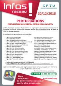 30 lignes du réseau Mozaïk ne sont pas desservies, ce jeudi 20 décembre 2018. Malgré la reprise du trafic suite à l’enlèvement des deux bus qui bloquaient les dépôts de la CFTU, on note des perturbations sur le réseau. Les lignes du TCSP ne sont toujours pas desservies à ce jour.