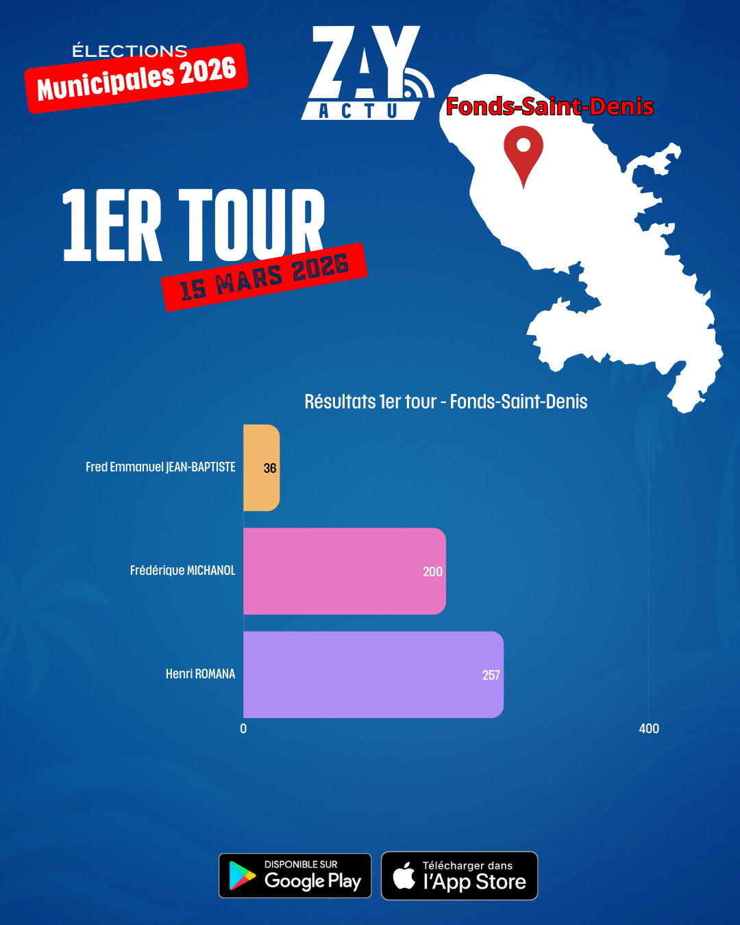 À Fonds-Saint-Denis, Henri Romana est élu maire avec 257 voix. Il devance Frédérique Michanol, qui recueille 200 voix, tandis que Fred Jean-Baptiste obtient 36 voix.