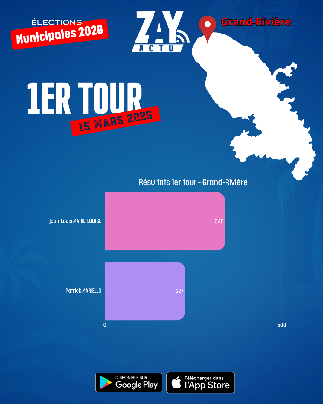 À Grand-Rivière, le maire sortant Jean-Louis Marie-Louise est également réélu. Il obtient 339 voix, confirmant sa reconduction à la tête de la commune.