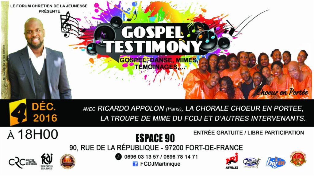Ce dimanche 4 décembre 2016, aura lieu le Gospel Testimony à l’espace 90 (90 rue de la république 97200 Fort-de-France) présenté par le forum chrétien de la jeunesse avec comme invité d’honneur pour la première fois Ricardo Apollon de Paris.