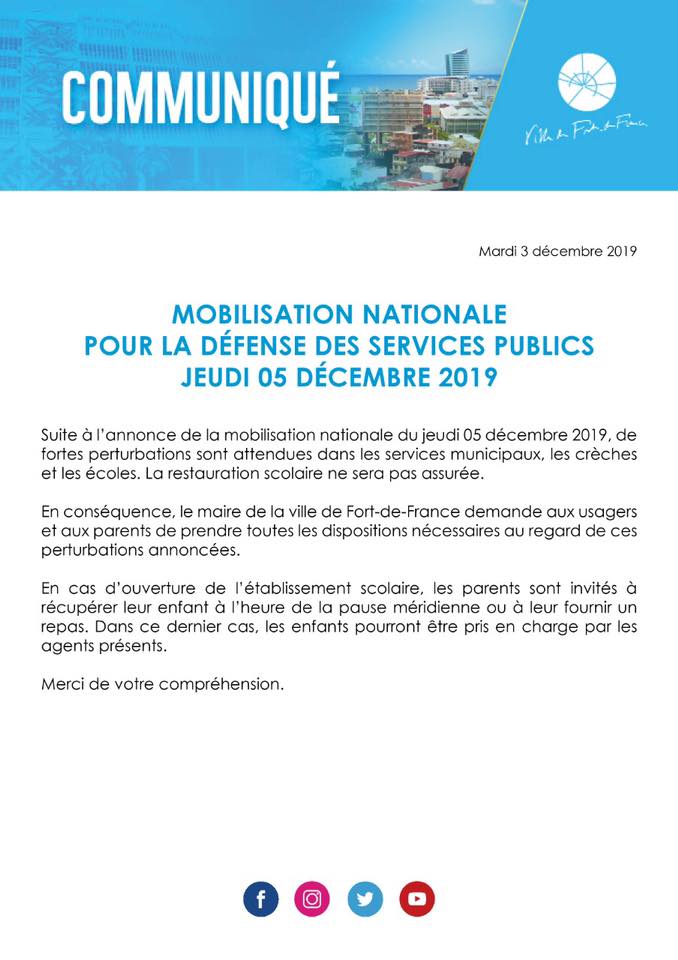 Un mouvement social est prévu, ce jeudi 5 décembre 2019 dans toute la France, mais également chez nous en Martinique. Un mouvement qui sera certainement très suivi. Quelques communes ont déjà annoncé qu’ils y aura des perturbations dans des écoles et dans les crèches. Le fonctionnement des autres services municipaux risque aussi d’être fortement perturbé.