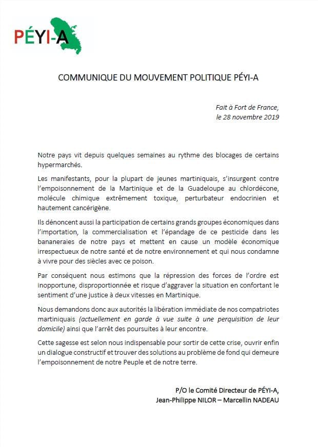 Suite à ça le mouvement politique Péyi-A est monté au créneau demandant « la libération immédiate de nos compatriotes martiniquais, ainsi que l’arrêt des poursuites à leur encontre ».