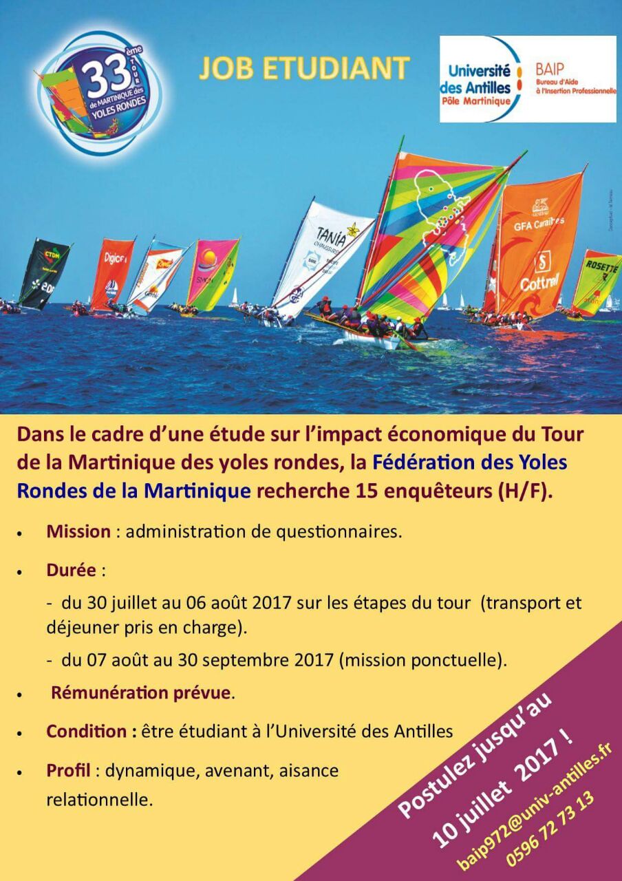 Vous êtes à la recherche d’un job étudiant ? Cette annonce est donc pour vous. La Fédération des Yoles Rondes de la Martinique recherches des enquêteurs. Vous avez jusqu’au 10 juillet pour postuler.