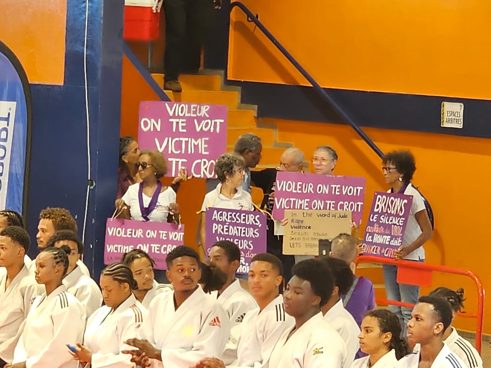 Sur les tatamis du hall Pellière-Donatien, l’atmosphère habituelle de compétition a laissé place, le temps de quelques instants, à un message grave et nécessaire. Une manifestation surprise est venue interpeller le public, les clubs présents et les instances sportives sur une réalité encore trop souvent tue dans le monde sportif.
