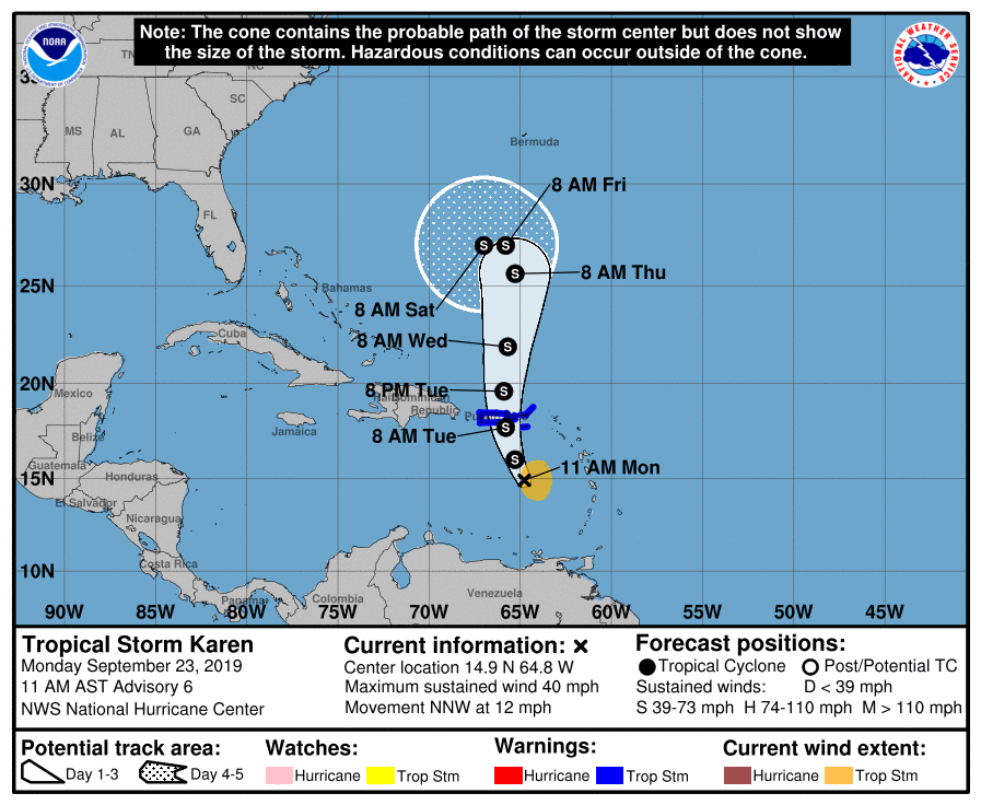 La faible tempête tropicale Karen se déplace actuellement à 13km/h et se dirige vers le nord-ouest vers Porto-Rico, les Îles Vierges américaines et britanniques qui sont actuellement en alerte tempête tropicale.