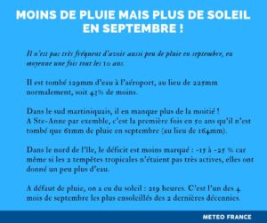 D’après Météo-France durant ce mois de septembre 2018 qui figure parmi l’un des 4 mois de septembre les plus ensoleillés ces 20 dernières années, on dénombre 219 heures d’ensoleillement. Le sud de la Martinique est le plus touché. La ville de Sainte-Anne par exemple n’a connu que 61mm de pluie contre 164 mm d’habitude. Une première depuis 50 ans.