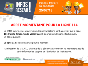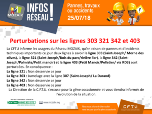 Du coup, les lignes 321 (Saint-Joseph/Bois du parc/Rivière l’or), 342 (Saint-Joseph/Palmiste/Petit Manoir) et 403 (Petit-Manoir/Pelletier/via RD3) ne sont pas desservies ce jour. La ligne 303 (Saint-Joseph/Morne des Olives) est jumelée avec la ligne 307 (Saint-Joseph/La Durand).
