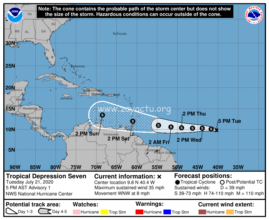L’onde tropicale forte placée sous surveillance par le NHC depuis maintenant 48 heures s’est rapidement renforcée. Alors que cette dernière n’avait que 20% de devenir un phénomène cyclonique, hier soir, ce dernier est finalement devenu une dépression tropicale. Elle devrait intéresser l’extrême sud de l’arc antillais, mais sa trajectoire devrait être confirmée dans les prochaines heures.