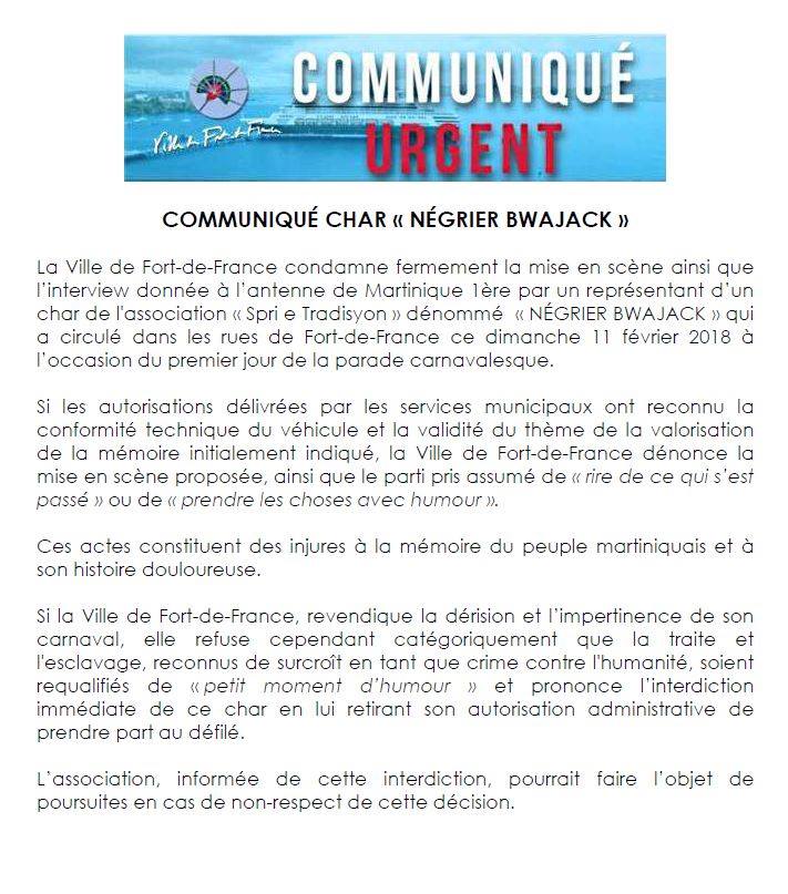 Souvenez-vous. Le dimanche gras, un char nommé « Négrier Bwadjack » avait fait polémique et coulé beaucoup d’entre ce qui avait obligé la ville de Fort-de-France à prendre un arrêté interdisant que ce char ne défile dans les rues.