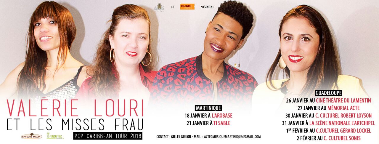Elles seront en Martinique le 18 janvier 2018 à l’Arobase et le 21 janvier à Ti-Sable. Puis en Guadeloupe avec 6 dates de prévues. Elles, c’est Valérie Louri et les misses FRAU.