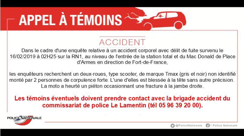 Dans le cadre d’une enquête relative à un accident corporel avec délit de fuite survenu le 16/02/2019 à 02H25 sur la RN1, au niveau de l’entrée de la station total et du Mac Donald de Place d’Armes en direction de Fort de France.