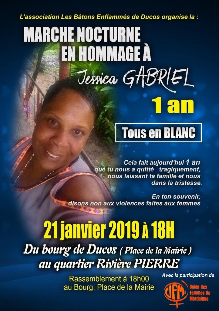 Bref, un an jour pour jour, ce dimanche 20 janvier 2019, une marche nocturne organisée par les Bâtons Enflammés de Ducos avec la participation de l’UFM lui sera consacrée afin de lui rendre hommage.« Cela fait aujourd’hui 1 an que tu nous a quittés tragiquement nous laissant ta famille et nous dans la tristesse. En ton souvenir, disons non aux violences faites aux femmes » décrit l’affiche annonçant la marche.
